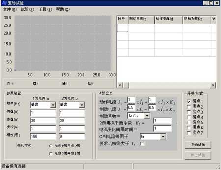 程序定義I1=Ia、I2=Ib,I1為1側電流(例如高壓側),I2為2側電流(例如低壓側),I1、I2的頻率可定義為基波,二次、三次諧波等。初值、終值、步長、相位用戶可自行設定,由于測試儀加進去的電流只是加到高低壓側,并不是真正的動作電流和制動電流,所以,動作電流Id和制動電流Iz需按一定的公式進行折算才能形成,界面上提供了一些公式,用戶根據保護廠家提供的公式進行選擇。由于I1、I2都在變化,可形成一個二維數組,并可在直角坐標上描出制動曲線。