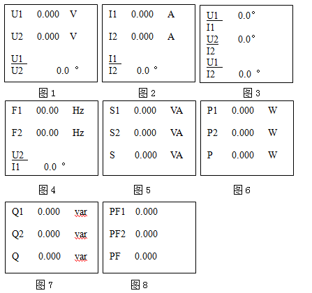 按下儀器開關(guān)鍵按鈕,儀器首先進(jìn)入電壓測量界面, 電壓、電流、功率、功率因數(shù)、頻率、相位是測量顯示的基本參數(shù),可直接按上下方向鍵查看各級數(shù)據(jù)。各顯示面如下: