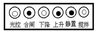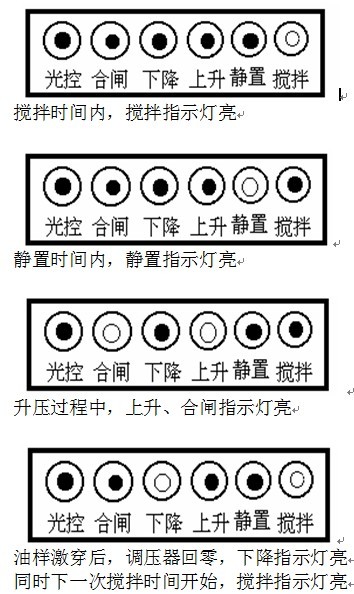 次數(shù),后三位顯示攪拌時間;攪拌完畢,振子停止攪拌指示燈滅,靜置指示燈亮開始靜置,指示燈滅后,合閘、升壓指示燈亮,進(jìn)入顯示同步升壓,此時顯示屏后三位數(shù)碼顯示為電壓(00.0KV)待油樣擊穿后,升壓電源自動分閘,顯示屏停止顯示5秒,打印機(jī)打印時間、電壓值;調(diào)壓器下,降下降指示燈亮,攪拌指示燈亮第二次測試開始,同時打印、顯示屏顯示擊穿電壓,顯示次數(shù)值閃爍,聲控提醒;調(diào)壓器回零后,下降指示燈滅、顯示停止閃爍、聲控消失,接著第二次測試;所有測試次數(shù)運(yùn)行完畢后,顯示屏顯示總次數(shù)的平均值,用英文字母表示(A、B、C、D、E、F、G、H、y)如僅測試一次顯示為A24.3KV,如測試六次顯示為F24.3KV;然后打印電壓平均值,油樣測試完畢,此時可重復(fù)顯示、打印,按復(fù)位鍵后,所有數(shù)據(jù)消失。在OPCU狀態(tài)下取出油樣,便可更換新油樣再次試驗,測試完畢在復(fù)位狀態(tài)下OFF位置關(guān)上電源。測試時指示燈運(yùn)行過程如圖五: