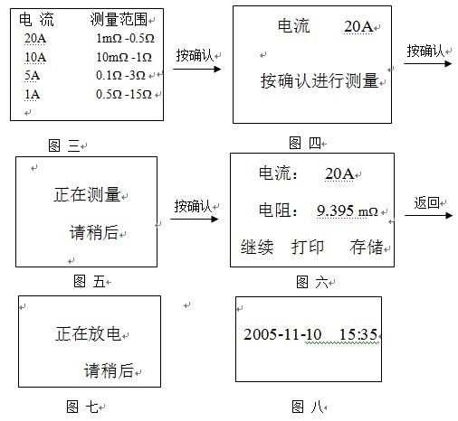 如圖三所示,按“↑、↓”鍵移動(dòng),按“確認(rèn)”鍵顯示圖四,按“確認(rèn)”鍵測(cè)量,按“返回”重新選擇電流。測(cè)量數(shù)據(jù)如圖六,數(shù)據(jù)穩(wěn)定后將鎖定并閃爍,選擇 “繼續(xù)”項(xiàng)將重新刷新數(shù)據(jù)即對(duì)同一點(diǎn)重新繼續(xù)測(cè)量;選擇“打印”項(xiàng),把當(dāng)前數(shù)據(jù)打印出來(lái);選擇“存儲(chǔ)”項(xiàng),將當(dāng)前數(shù)據(jù)及日期保存起來(lái);按“返回”鍵將放電如圖七并有蜂鳴聲,放電完畢后,蜂鳴器聲停止;重新進(jìn)入畫(huà)面三,按“返回”鍵返回主菜單圖二。